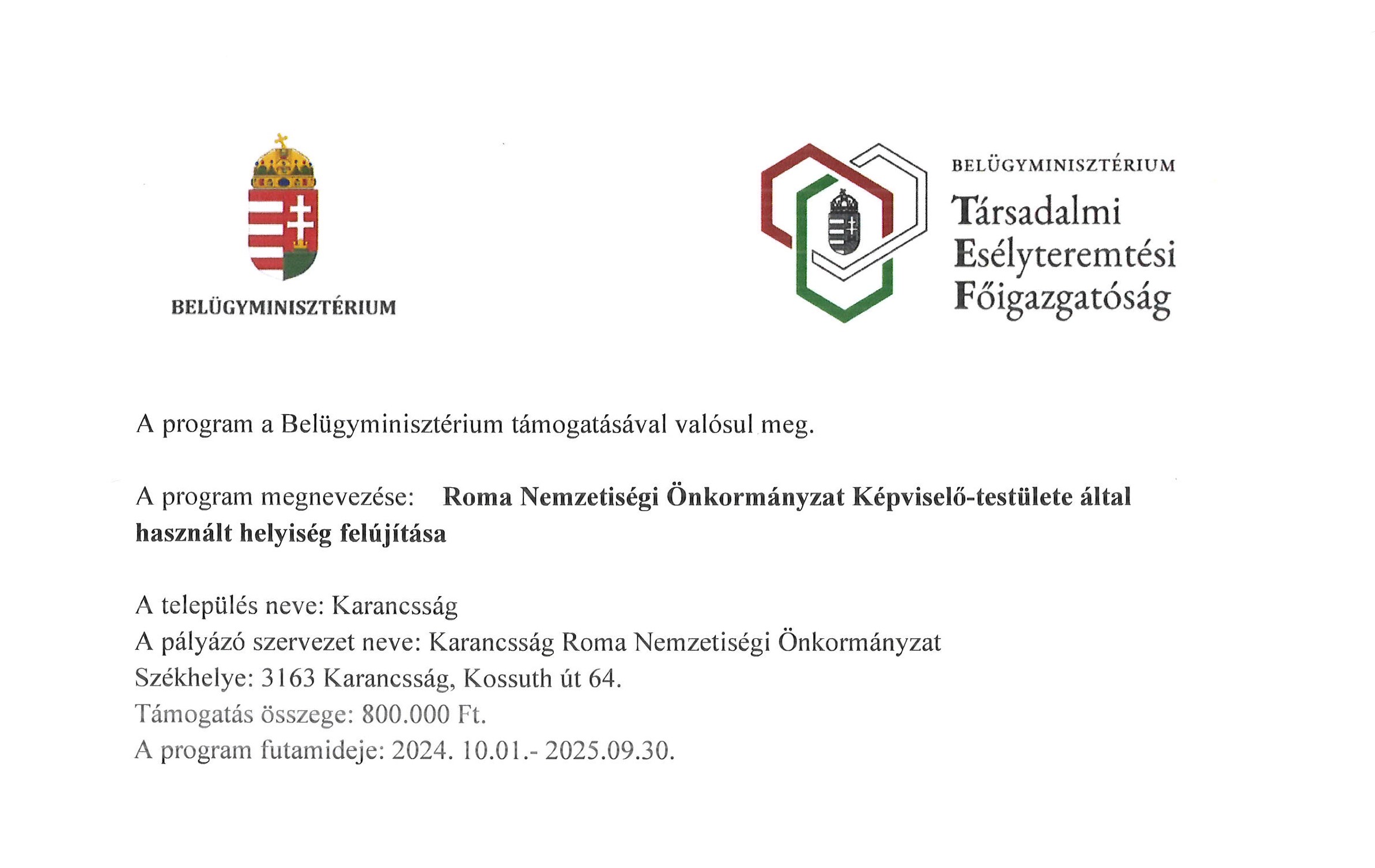 A Karancsság Roma Nemzetiségi Önkormányzat sikeresen rész vett a Belügyminisztérium megbízásából a Társadalmi Esélyteremtési Főigazgatóság által meghirdetett ROMA-KAPACITÁS-24 pályázaton, amelynek célja, Roma nemzetiségi önkormányzatok, vallási egyesületek és roma civil szervezetek kapacitásainak, infrastrukturális fejlesztésének támogatása.